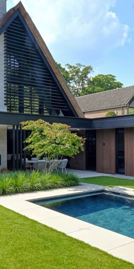 Onze ontwerpen zijn niet alleen esthetisch sterk, maar ook functioneel en duurzaam. We houden rekening met het veranderende klimaat, waterafvoer, onderhoudsgemak en de levensduur van materialen.