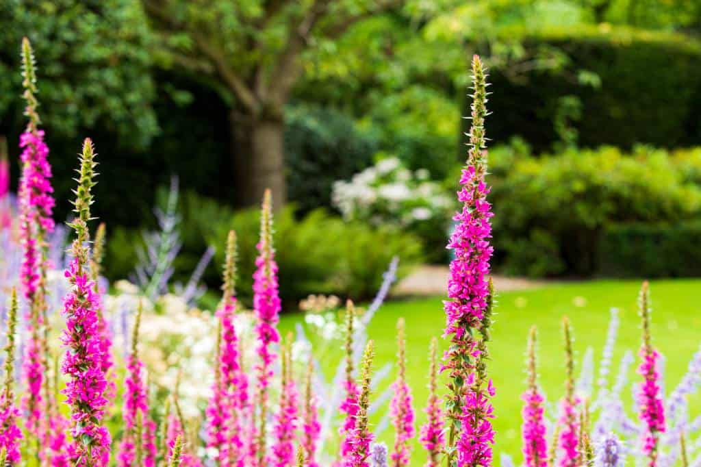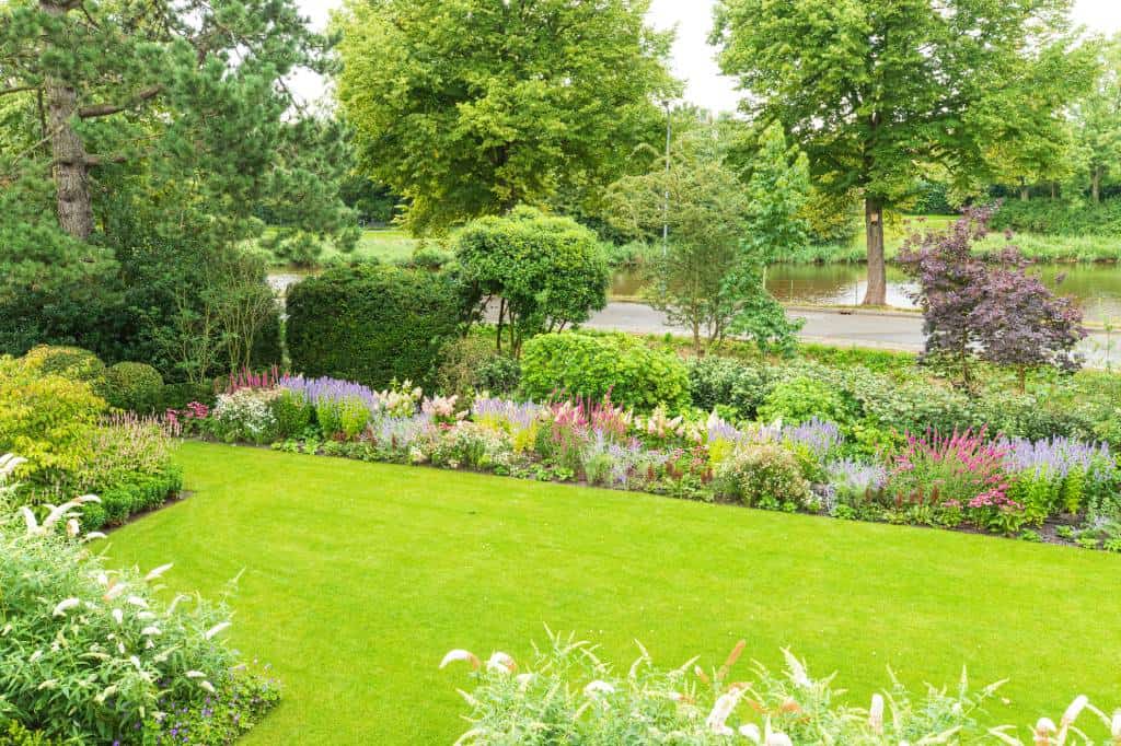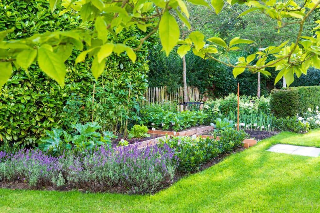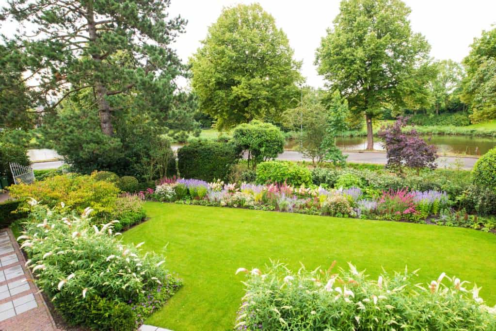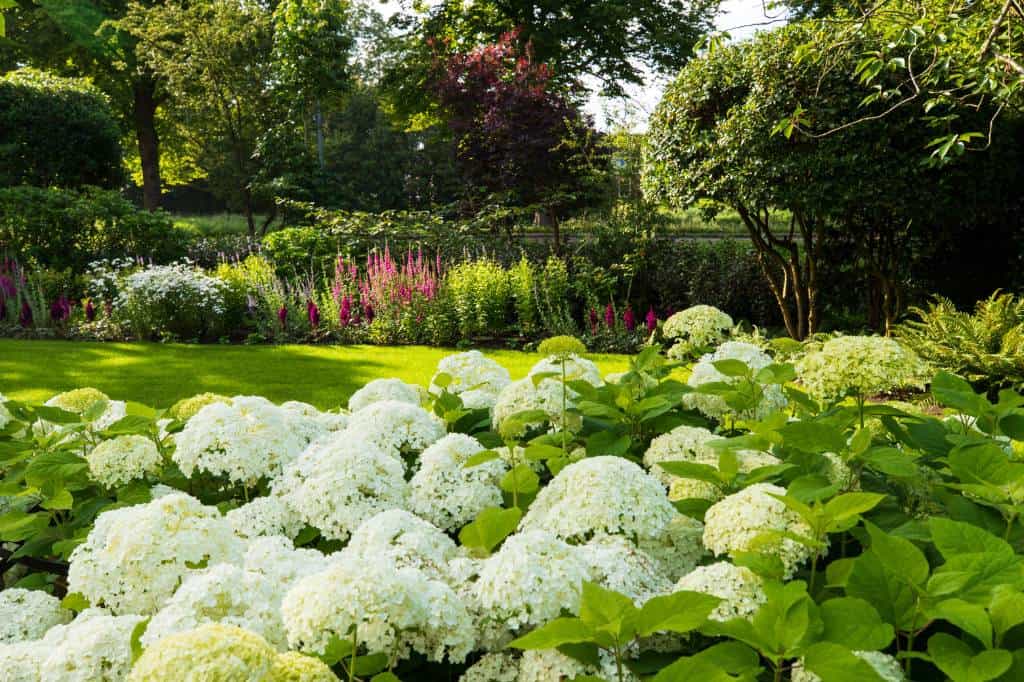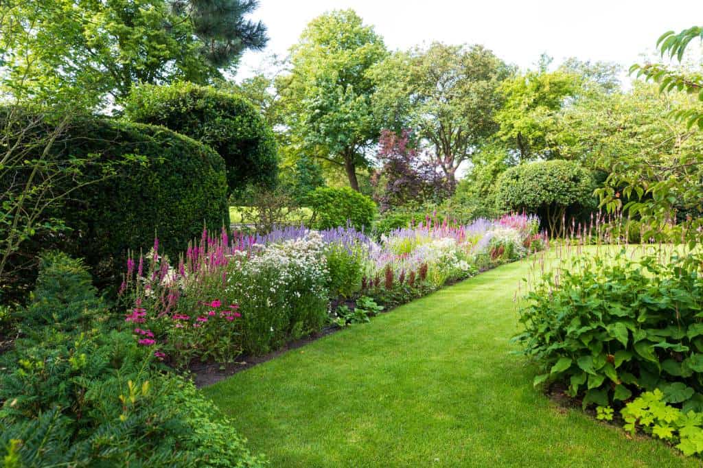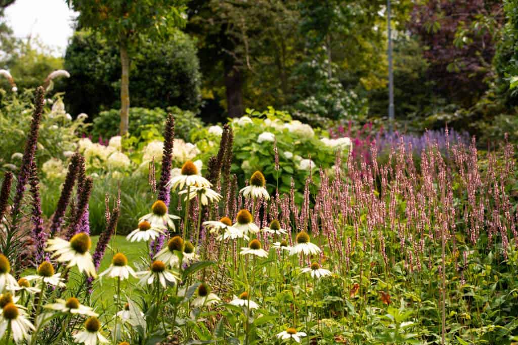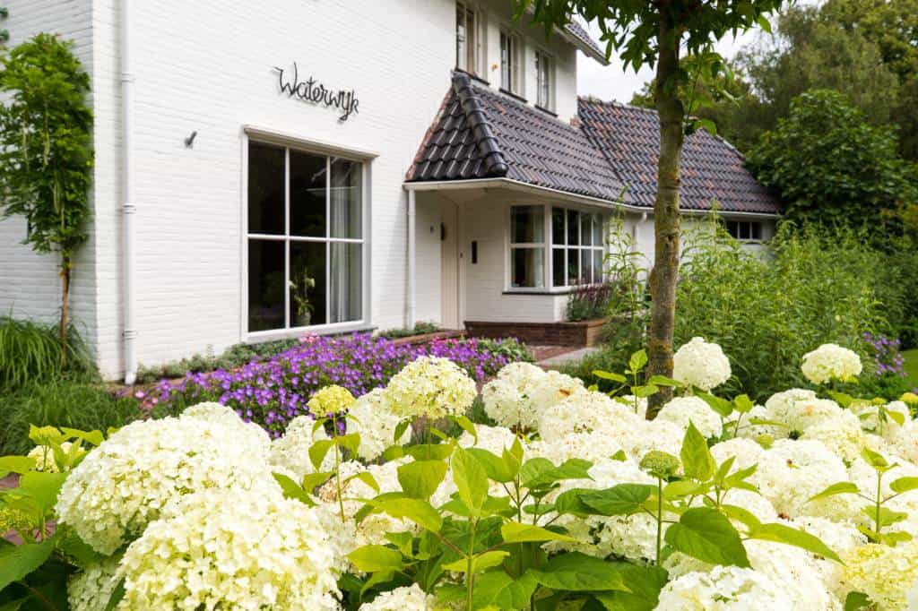 De beplanting bestaat binnen deze tuin uit vakken met siergrassen, hortensia’s, vaste plantenborders en rozen. De hagen zijn van taxus en olijfwilg.
