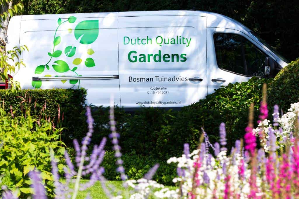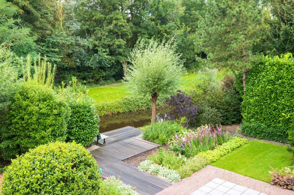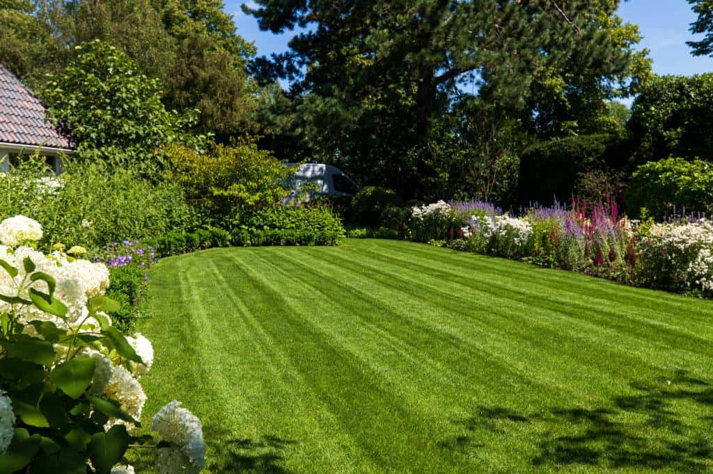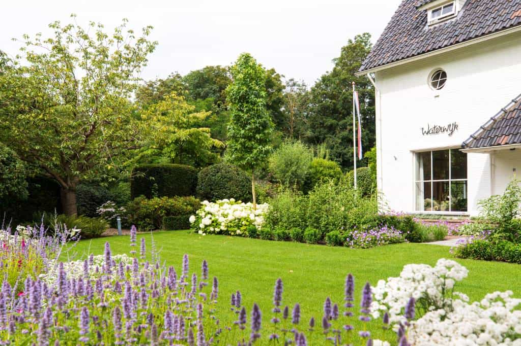 Naast het rustgevende groen van de ruime gazons, is er gebruik gemaakt van halfverharding in de vorm van schelpjes.