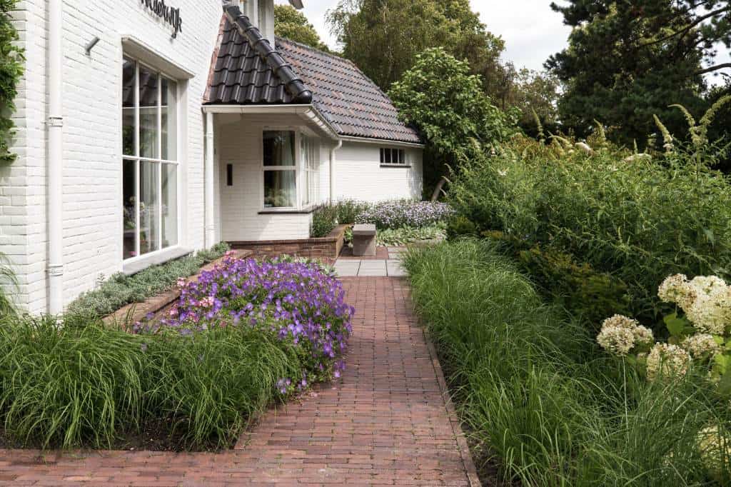 Terrassen en de oprit zijn gemaakt van gebakken klinkers in combinatie met Arduin tegels.