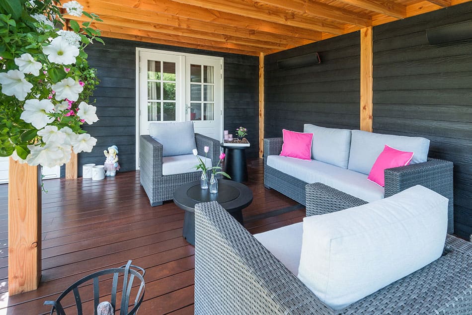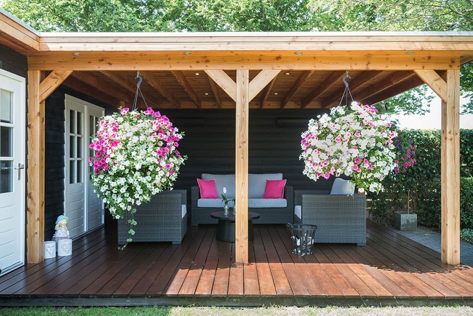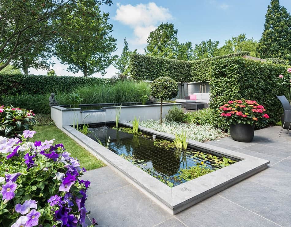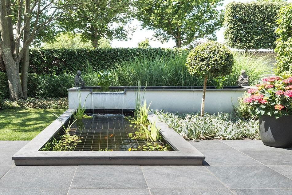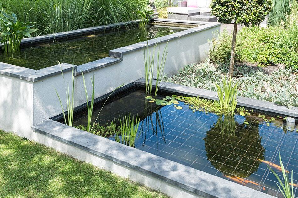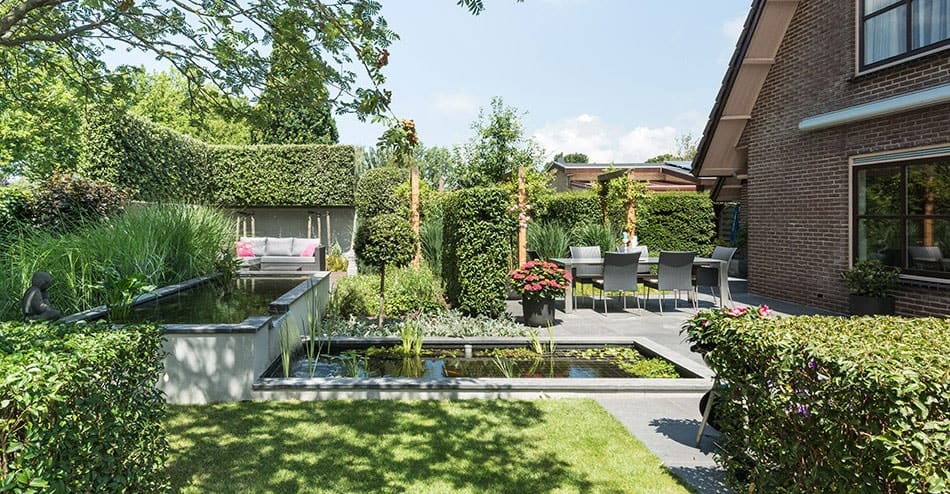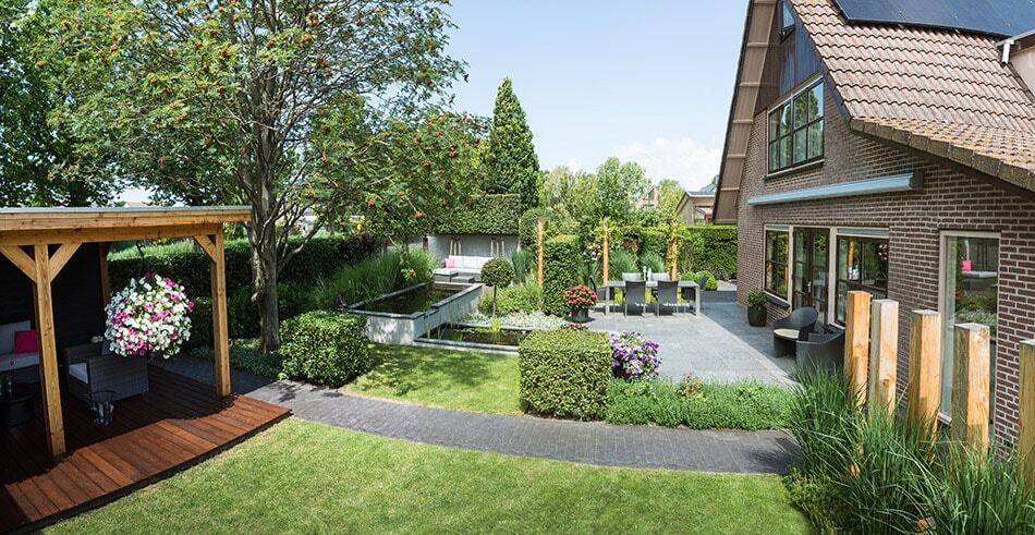 Moderne tuin met vijvers, pergola en houten overkapping