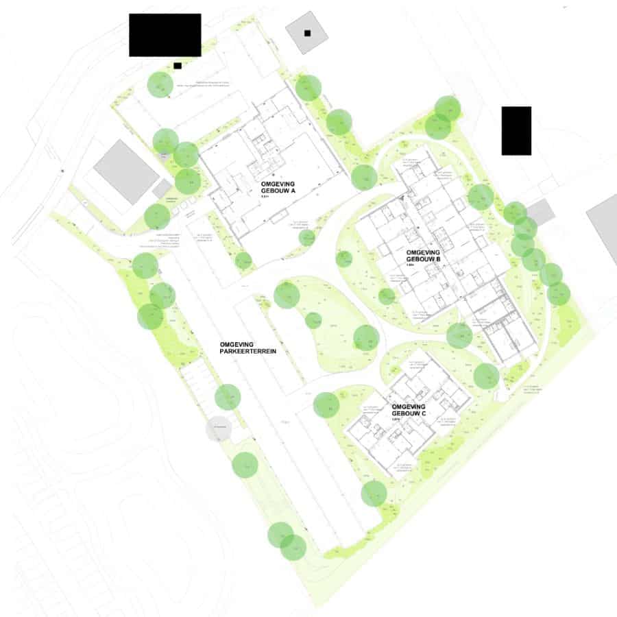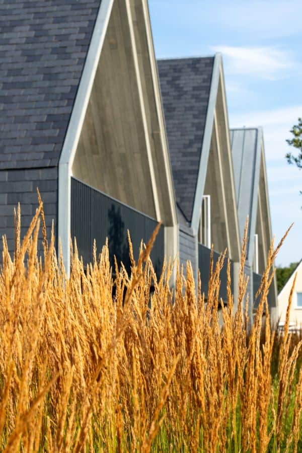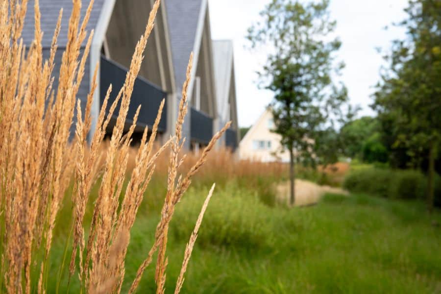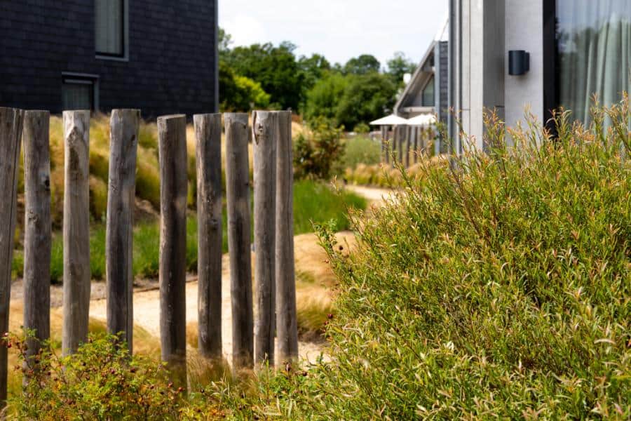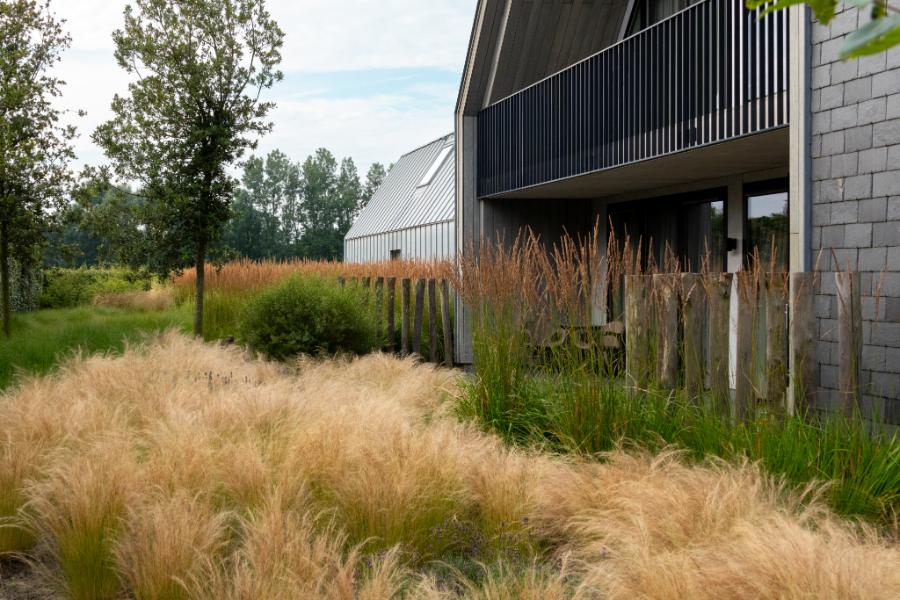 Slingerende paden van natuurlijke halfverharding leiden bezoekers als vanzelf naar hun bestemming. Wuivende siergrassen vormen het hart van de beplanting, aangevuld met karakteristieke duinvegetatie die het hele jaar door interessant blijft en voor privacy zorgt.