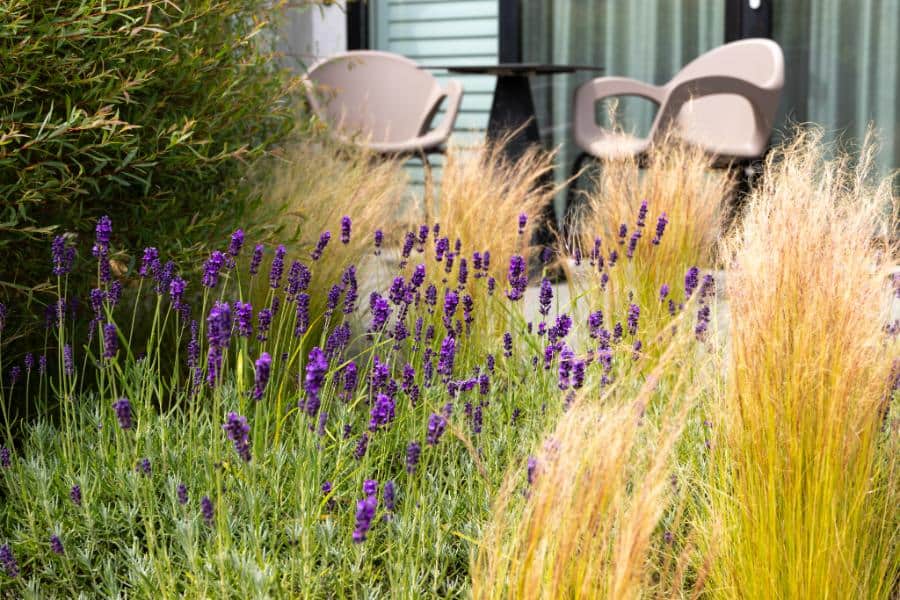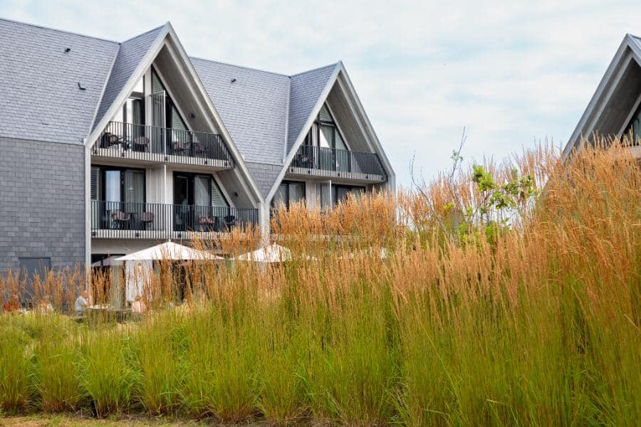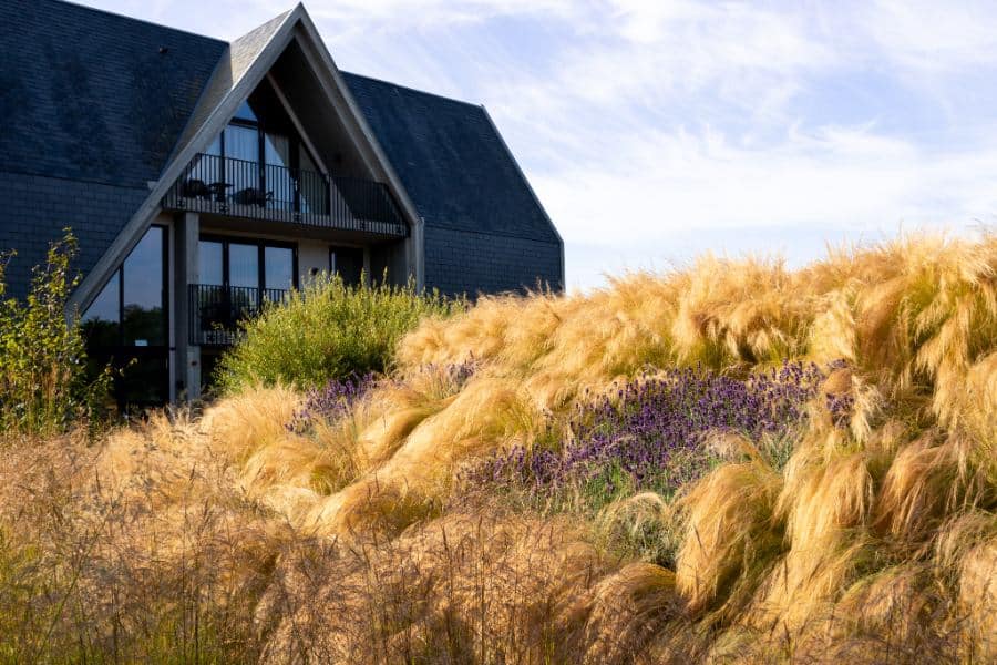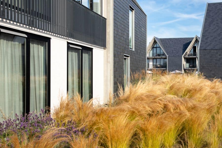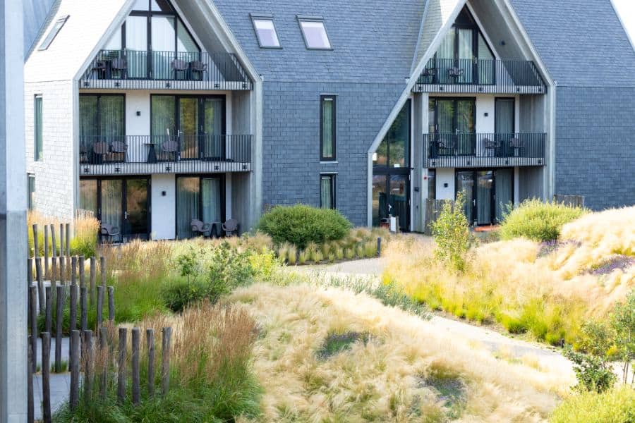 Tuin rondom hotel in de duinen met siergrassen, paden en borders